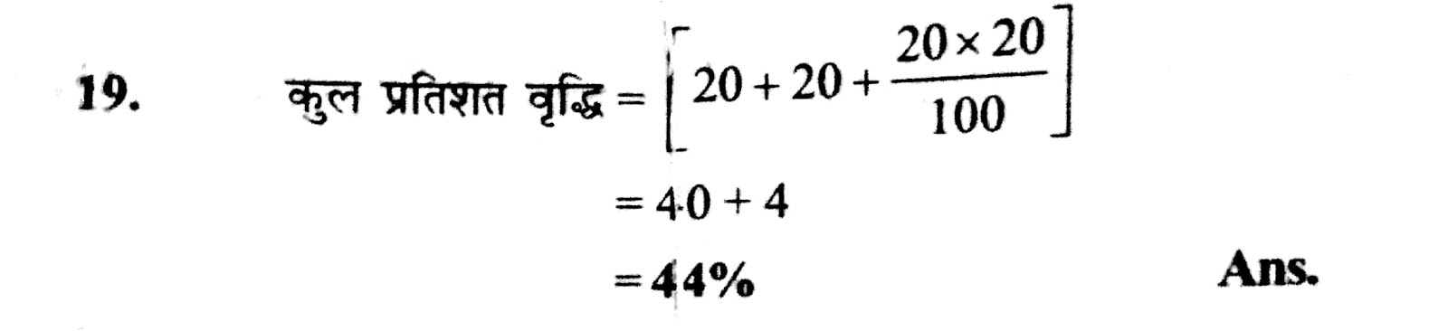 Q. 19 यदि किसी संख्या में 20% की वृद्धि की जाय तथा परिणामी संख्या में पुनः 20% की वृद्धि की जाय , तो कुल वृद्धि कितने प्रतिशत होगी ? DELHI PPLICE 2007